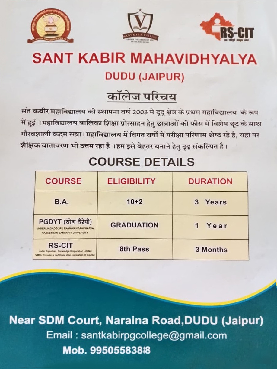 Sant Kabir College was established in year 2003 as the first college in the Dudu region. The college took a commendable step by offering special fee concessions to female students to encourage girl's education.